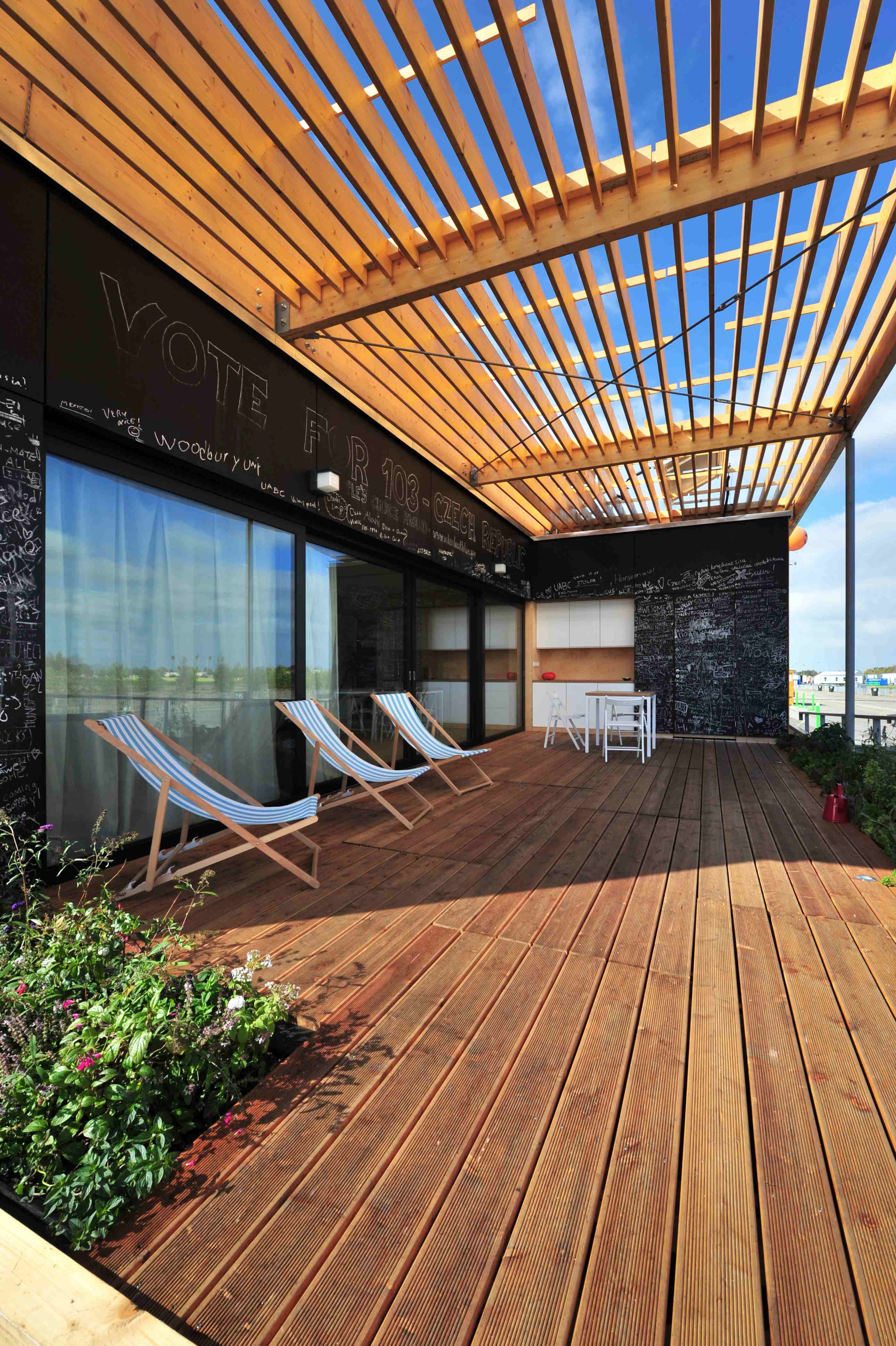 Přímá vazba venkovního a vnitřního prostoru a jeho tvarová jednoduchost a bezbariérový přístup umožňuje provozování společenských aktivit a tím začlenění obyvatel domu do lokálního sociálního života. Prostor terasy je vhodný pro venkovní promítání, pořádání vzdělávacích besed, tanečních večerů nebo hraní společenských her. Vnější povrch fasády směrem na terasu tvoří překližkové desky natřené tabulovou barvou. Je tak vytvořena interaktivní fasáda, kde si obyvatelé mohou zanechávat vzkazy a děti kreslit.