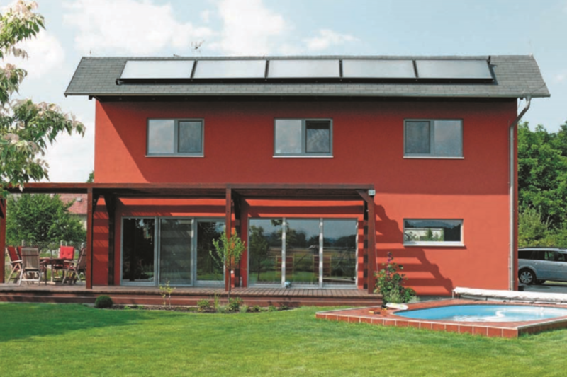 Dům realizovaný společností VS DOMY je důkazem, že panelová technologie dřevostaveb se nevyhýbá ani projektům řešeným na míru podle potřeb stavebníků. Oproti původnímu projektu se pouze přidávala tepelná izolace, což umožňuje vlastní systém celostěnových sendvičových panelů firmy VS DOMY. Vytápění zajišťuje integrovaný zásobník tepla s rekuperační jednotkou a solárními panely pro ohřev teplé vody. Přebytek teplé vody v létě proudí do bazénu u terasy.