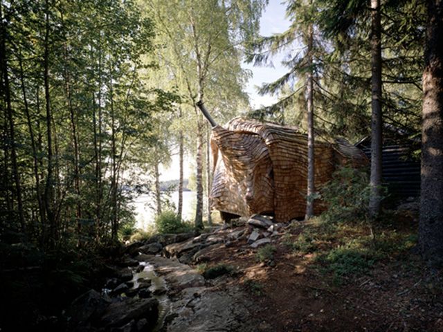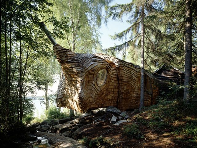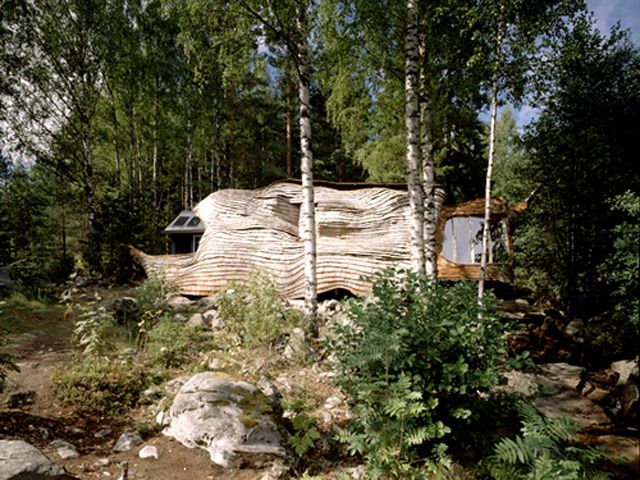 Střešní krytina, která pokrývá vnější stranu celého domu, byla použita dobovým způsobem, který byl ve Švédsku běžný před mnoha lety. Šindele z červeného cedru, tvořící plášť domu, byly dovezeny z Kanady. Svým tvarem a zvlněnými linkami cedrového pláště připomíná dům obrovského plaza.