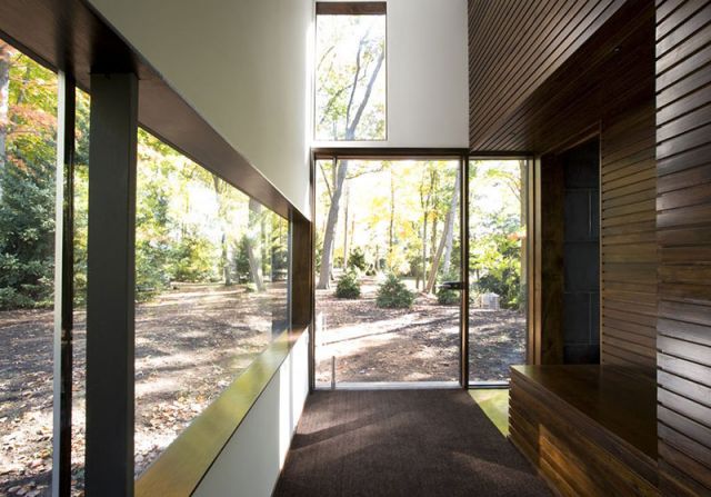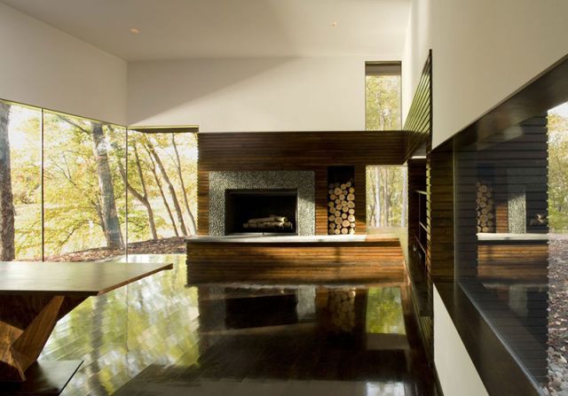 Oproti poměrně striktním a jasným liniím venkovní hmoty, zahalené do tmavého, dřeveného hávu, je interiér pojatý vzletněji a organičtěji. Bíle omítnuté stěny jsou doplněny o obklad z ořechového dřeva a místní tmavé břidlice. Za zmínku stojí především koupelna, kde je použito několik zajímavých prvků. Sprcha, tvořená hlavicí simulující přírodní déšť, je vestavěna v proskleném rohu a člověk tak při sprchování zažívá zvláštní pocit souznění s okolní krajinou. Zajímavě je vyřešeno i dřevěné umyvadlo, jehož konstrukce mistrně skrývá veškeré potrubní rozvody. Centrem celého domu se stává krb, umístěný tak, aby na něj měl výborný výhled především spisovatel, sedící za dřevěným, na zakázku vyrobeným stolem.