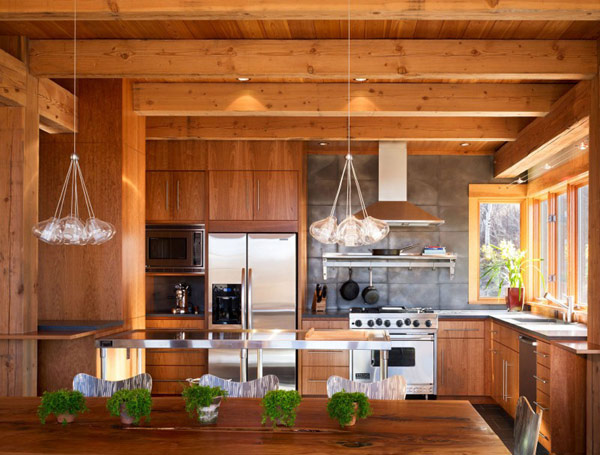 Interiér je velice vzdušný a prostorný, příjemné dřevo člověka obtéká doslova ze všech stran. Velké prosklené plochy zaručují úzké sepjetí s divokou okolní přírodou a vpouští dovnitř dostatek denního světla. Tradiční rustikální prvky tu v poklidu koexistují s moderními detaily a společně vytváří příjemný výsledek.