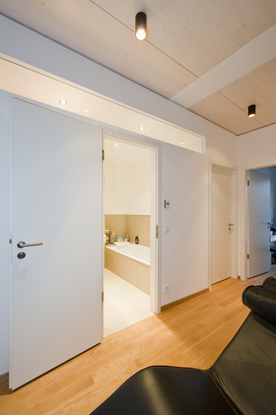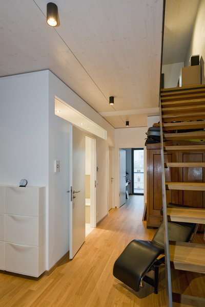Aby bylo i přesto možné realizovat dřevostavbu podle plánu, pověřili architekti již na počátcích společnost Dehne, Kruse Brandschutzingenieure GmbH & Co. KG zpracováním individuální komplexní požární koncepce. Ta obsahuje vedle technické situace, která zjišťuje přístup pozemku pro hasičský záchranný sbor, příp. zajištění požární vody, i únikový a záchranný plán a také systémová technická opatření. Budova je vybavena schodištěm ze železobetonu, které funguje jako první úniková cesta. Délka únikových cest max. 14 m je přitom značně nižší, než je stanovená požadovaná délka. Dveře s požární odolností 30 minut značně překračují požadavky berlínského stavebního řádu, který požaduje jen těsné a samočinné zavírání. Veškeré užitné prostory jsou vybaveny druhou únikovou cestou - minimálně jedním oknem, ke kterému může být přistaven žebřík. Proto byl z důvodu výšky horního podlaží s obytnými prostory o 19,65 m dům opatřen nástupními plochami pro otočné žebříky.