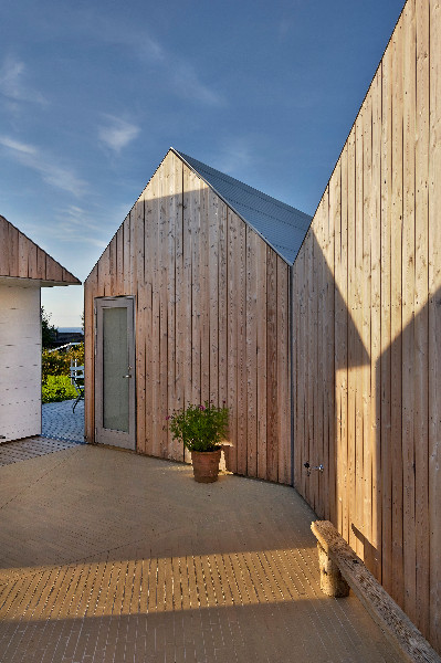 Intenzivní vítr je pro tento kraj typický, proto tradiční stavení využívají osvědčenou kompozici – objekty jsou orientovány kolem malého nádvoří, čímž vzniká příjemný a chráněný prostor. Nejinak je tomu i v případě této elegantní novostavby složené z pěti částí, kde každý z možných uživatelů najde své místo šité na míru. Na 123 m2 zastavěné plochy je k dispozici budova s kuchyní, objekt pro rodiče, děti, hosty a technické zázemí.