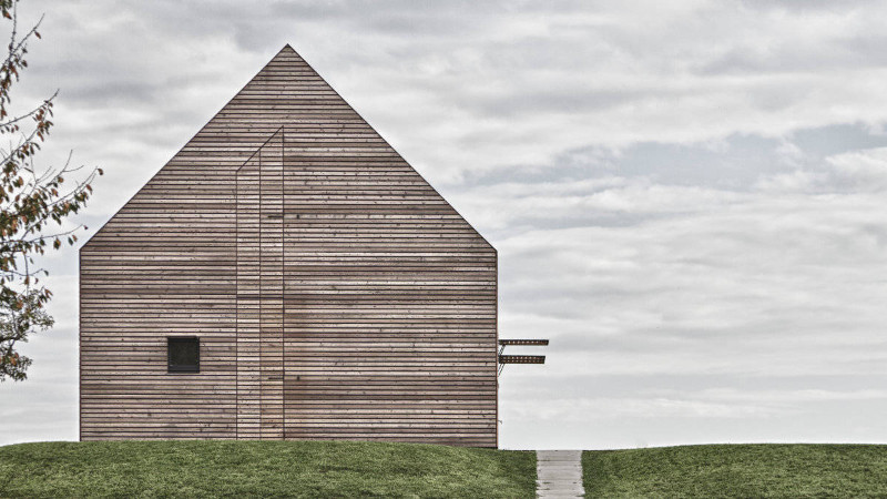 Protože dům bude obýván pouze od jara do podzimu, vytvořila Judith Benzer vnější obálku pro celý dům z modřínového dřeva, do níž lze dům kompletně uzavřít a uvést ho tak říkajíc do zimního spánku. Sklopné a skládací předokenní prvky (okenice) v uzavřeném stavu plynule splývají s fasádou. Modřínová terasa je optickým stínem budovy a kreativním pokračováním obalu domu do horizontálního prostoru.