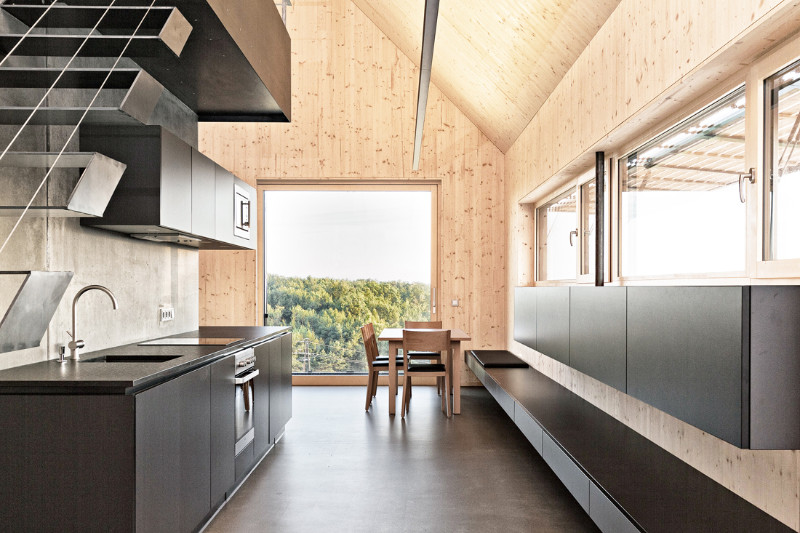Zatímco sklep je masivní z armovaného betonu, obě nadzemní podlaží jsou konstruovány jako dřevostavba z CLT panelů v pohledové kvalitě. Kromě toho, že typickým způsobem dotvářejí panely prostředí interiéru, fungují zároveň jako nosné prvky. Architektonickým záměrem bylo vytvořit dva protipóly: pohledově teplé, lehké dřevo a masivní, chladný beton. Materiály byly záměrně použity bez významných povrchových úprav či obložení, aby svou kombinací vytvořily homogenní prostorový účinek.