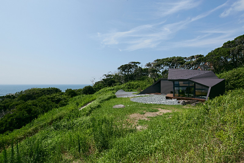 Architekt Takeshi Hirobe z ateliéru Takeshi Hirobe Architects byl pověřen návrhem víkendového domu na pozemku v kopci nad Tokijským zálivem. V pozadí se tyčí útes se vzrostlými stromy, zpředu se otevírá úžasným výhledům na oceán. Na břehu Tokijského zálivu rozehrál doslova symfonii. Pro umocnění dojmu ze svého díla totiž využil podobných prostředků jako při skládání hudby.