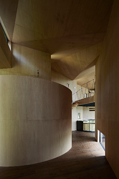 Čím hlouběji pak vstupujeme do obývacího pokoje a blížíme se k proskleným stěnám, tím více se výhled otevírá ještě ve vertikálním směru a v rytmu velkého finále se tak do zorného úhlu dostává i nebe. Takeshi o svém díle prozradil, že jednotlivé interiérové sekvence chápal jako melodie, které musí být ve vzájemné harmonii. Aby prostorový charakter stavby ještě umocnil, použil na vnitřní povrchy stěn i stropů překližku, která zajišťuje kontinuitu spojitého prostoru.
