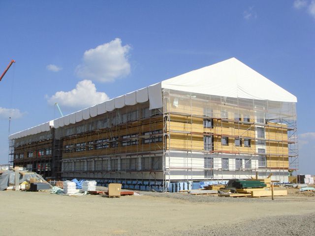 V unikátním objektu jsou sádrovláknité desky FERMACELL použity hlavně z důvodu plnění náročných požadavků na požární bezpečnost, statiku a akustiku v oblasti obvodových stěn, dělicích a vnitřních stěn a příček. Deskami FERMACELL jsou opláštěny i podhledy. Stavební systém tvoří masivní dřevěné panely, opláštěné sádrovláknitými deskami FERMACELL, které slouží také jako účinná požární ochrana všech nosných částí stavby.