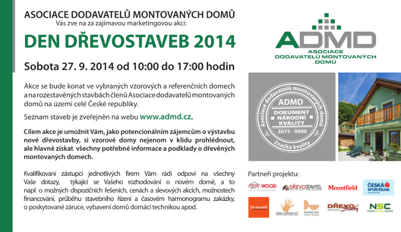 ADMD pořádá pro příznivce dřevostaveb a zejména pro ty, kteří se pro výstavbu dřevěného domu teprve rozhodují, první ročník marketingové akce, jejímž cílem bude propagovat nejenom vzorové a referenční domy, ale i rozestavěné stavby členských firem ADMD. Smyslem bude přiblížit laické veřejnosti moderní dřevostavby, jejich konstrukci, vlastnosti a samotnou technologii výroby.