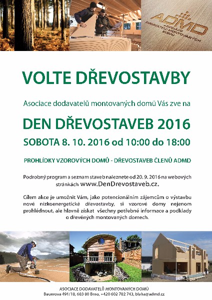 Asociace dodavatelů montovaných domů (ADMD) letos v říjnu pořádá již třetí ročník oblíbené akce „Den dřevostaveb 2016“. Zájemci si budou moci prohlédnout některý s téměř čtyřiceti realizovaných domů po celé ČR. Akce se koná 8. 10. 2016.