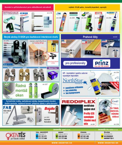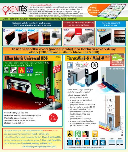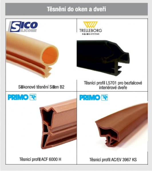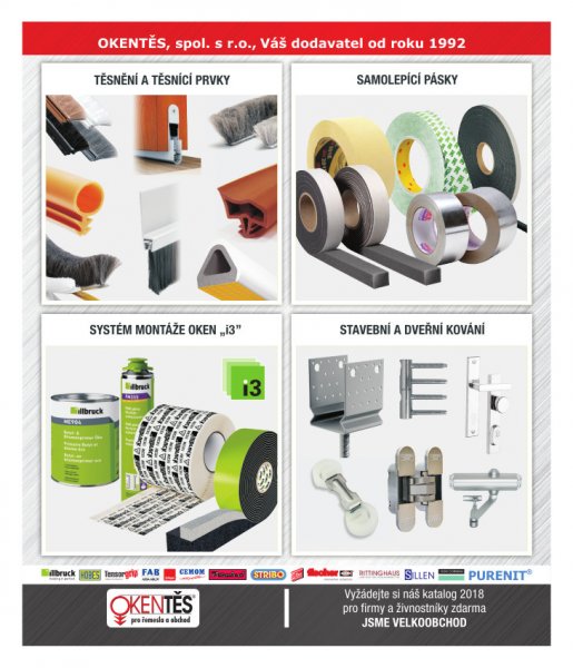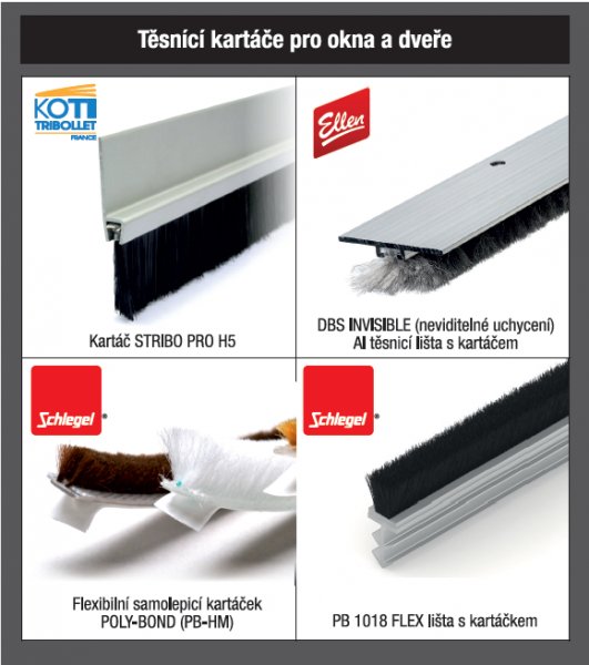 Dodáváme okenní a dveřní těsnění, trubičková i EURO, silikonová, TPTE i samolepící, stavební a bytové kartáče, kartáčky na lodžie a skříně, padací prahy hobby i protipožární s útlumem 50dB, prahové a přechodové lišty. V nabídce máme taky tmely, silikony a PUR pěny, lepidla, kování pro okna i dveře, metry, hmoždinky, elektronářadí, excentry, rychlosvěrky. Dodávky jsou určeny pro výrobce, řemeslníky i obchod. Dovážíme pro Vás od 15 zahraničních partnerů. Katalog pro firmy zdarma.