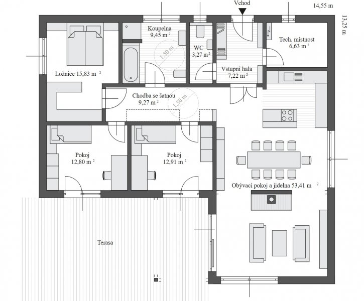 Jak už samotný název napovídá, tento přízemní dům dokonale spojuje požadavky na praktičnost s estetikou a elegancí. Senzační design, vysoké stropy, prostorné chodby a čisté linie vám dodají pocit volnosti.