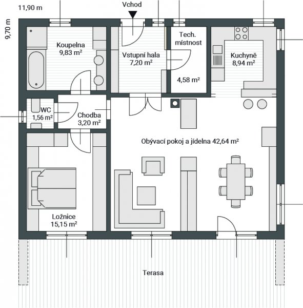 Nadčasový a praktický bungalov Modo 93 s dispozicí 2+kk a užitnou plochou 93 m² se díky kompaktním rozměrům (11,9 × 9,7 m) vejde i na menší pozemky. Dispozici lze snadno upravit na 3+kk, což zvyšuje variabilitu domu.