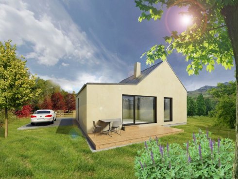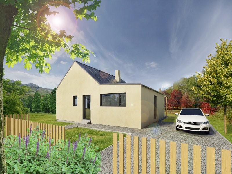 Přízemní nízkonákladový rodinný dům vhodný pro malou rodinu, případně pro manželský pár, který vyžaduje samostatnou pracovnu či pokoj pro hosty. Dispozice domu jsou promyšlené tak, aby zajistily veškerý komfort jeho uživatelům. Přední část domu je určená pro sociální zázemí a zadní pro společný život rodiny. Hlavní obytná místnost spojuje obývací část s jídelním koutem i kuchyní. Využití tohoto prostoru a návrh interiéru je variabilní a lze ho uzpůsobit dle vašich požadavků. V dispozicích domu nechybí samostatné WC oddělené od soukromé koupelny. Toto řešení skloubí nové ekologické bydlení se zdravým vnitřním klimatem na vlastním pozemku (v soukromém objektu bez přímých sousedů). Francouzská okna jsou orientována do zahrady, kde je možné dodatečně zastřešit terasu či vybudovat pergolu. Nízkoenergetický provoz domu nezatíží vaši peněženku a realizace Vaší představy od projektu po konečnou finalizaci stavby pod jednou firmou zajistí vaši plnou spokojenost.
