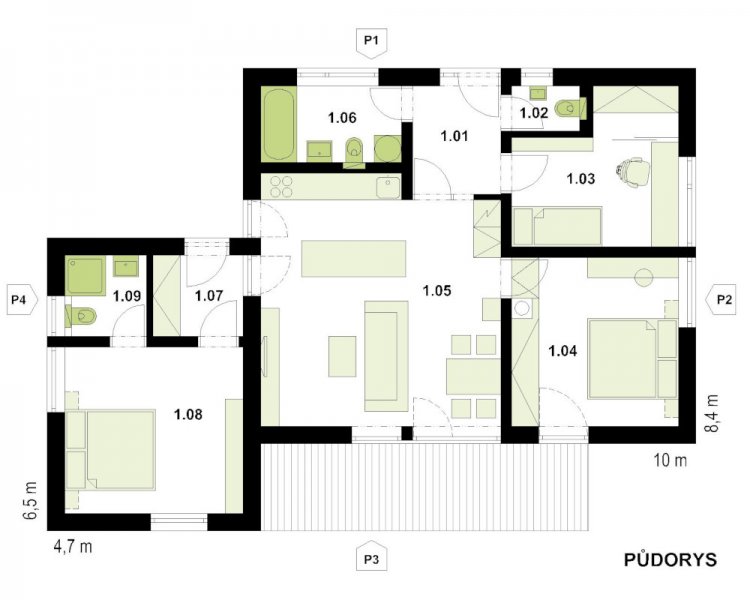 Přízemní nízkonákladový rodinný dům s přístavbou. Základní část je stejná jako u domu Alfa 83, ale přístavba o ploše 30 m2 dává tomuto typovému domu novou možnost využití. Základní pravá část domu je vhodná pro malou rodinu, případně pro manželský pár, který vyžaduje samostatnou pracovnu či pokoj pro hosty. Přístavba vytváří nové prostory se samostatným vstupem a sociálním zázemím pro nové využití. Jednou z variant je soukromá jednotka pro staršího člena rodiny nebo samostatná jednotka pro podnikání. Pokud budeme uvažovat dům jako celek pro jednu rodinu s více dětmi, je možné v této jednotce získat prostornou ložnici s vlastní koupelnou pro rodiče. Dispozice domu jsou promyšlené tak, aby zajistily veškerý komfort jeho uživatelům. Hlavní obytná místnost spojuje obývací část s jídelním koutem i kuchyní. Využití tohoto prostoru a návrh interiéru je variabilní a lze ho uzpůsobit dle vašich požadavků. Toto řešení skloubí nové ekologické bydlení se zdravým vnitřním klimatem na vlastním pozemku (v soukromém objektu bez přímých sousedů). Francouzská okna jsou orientována do zahrady, kde je možné dodatečně zastřešit terasu či vybudovat pergolu. Nízkoenergetický provoz domu nezatíží vaši peněženku a realizace Vaší představy od projektu po konečnou finalizaci stavby pod jednou firmou zajistí vaši plnou spokojenost.