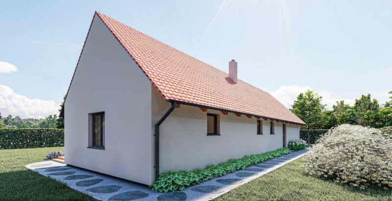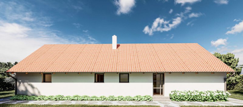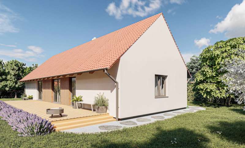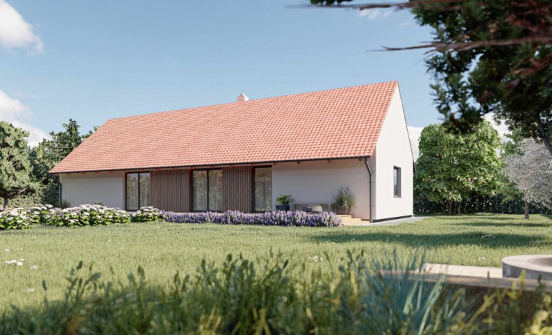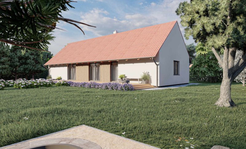 Oblíbená nízkoenergetická dřevostavba v provedení s výrazným přesahem střechy je klasika, která se hodí spíše pro venkov. Domov, který je nový a moderní a přitom vypadá, že existuje věky, je určený především milovníkům tradičních staveb. Domu vévodí velký obývací prostor s kuchyní, odkud je vstup na terasu nebo do zahrady. Tři pokoje, šatna a rozsáhlé technické zázemí uspokojí náročnou klientelu.