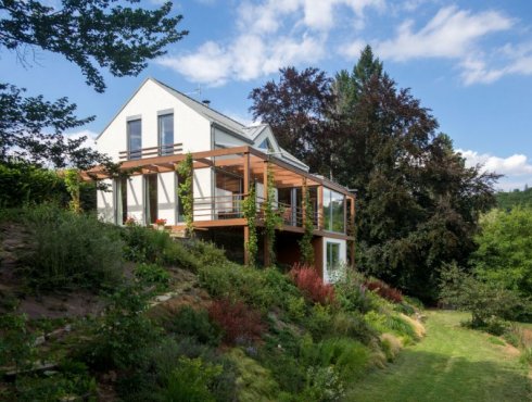 Tento dům s překrásným výhledem na řeku Sázavu je navržen pro bydlení čtyřčlenné rodiny. Založení objektu je zamýšlené na základových konstrukcích po demolici stávajícího objektu. Pro nosnou konstrukci domu jsme zvolili konstrukční systém se stěnami z třívrstvých masivních dřevěných desek. Fasádu pojímáme bílou omítkou a dřevěnými prvky pergoly, připravenými pro vinnou révu. Obytný prostor a prosklená jídelna se otevírají do údolí Sázavy na jižní straně. V horním patře navrhujeme tři pokoje, prostornou koupelnu a pracovnu. Vytápění objektu předpokládáme pomocí elektrických podlahových rohoží s akumulační vrstvou a elektrickými přímotopy, podporované řízeným větráním s rekuperací tepla.