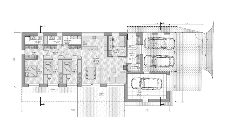 Dispozice domu 5+kk s garáží nabízí velký prostorový komfort pro 4člennou rodinu. Vnitřní dispozice domu je rozdělena na společenskou a klidovou část. Z prostorné předsíně je přístupný obývací pokoj s kuchyní a jídelnou a pracovna. Přímo z předsíně je pak také samostatná prádelna.