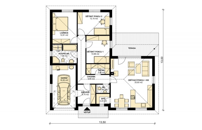 Ideální bude rovinatý pozemek. Případným zrcadlením dispozice lze dům umístit i na méně vhodné parcely z hlediska orientace ke světovým stranám.