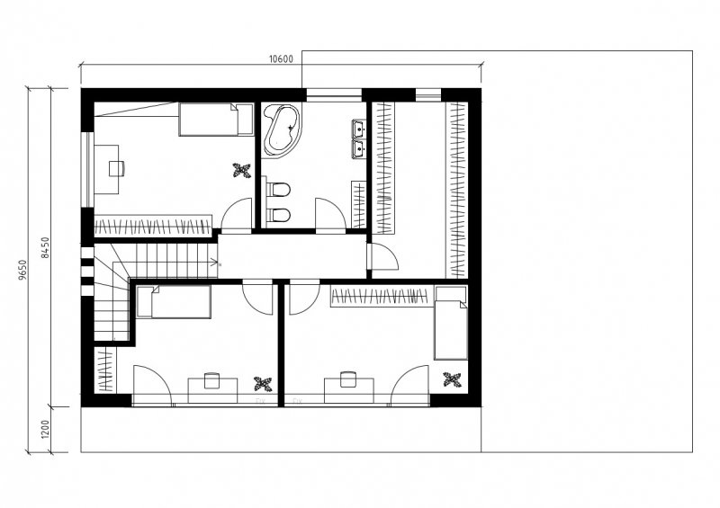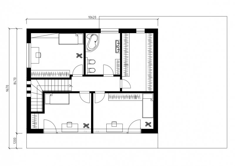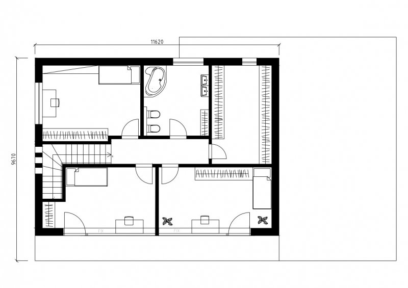 Prostorná koupelna a velká technická místnost pak dotváří ucelenost spodního patra. V hodní části domu se nachází 3 ložnice, koupelna a prostorná šatna.