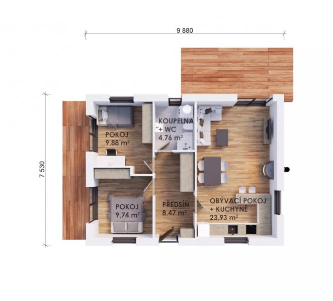 Dispozice: Objekt má jedno nadzemní podlaží s jednou jednotkou 3+kk – vstup s chodbou, obývací pokoj s kuchyňským koutem, koupelna, pokoj a ložnice.