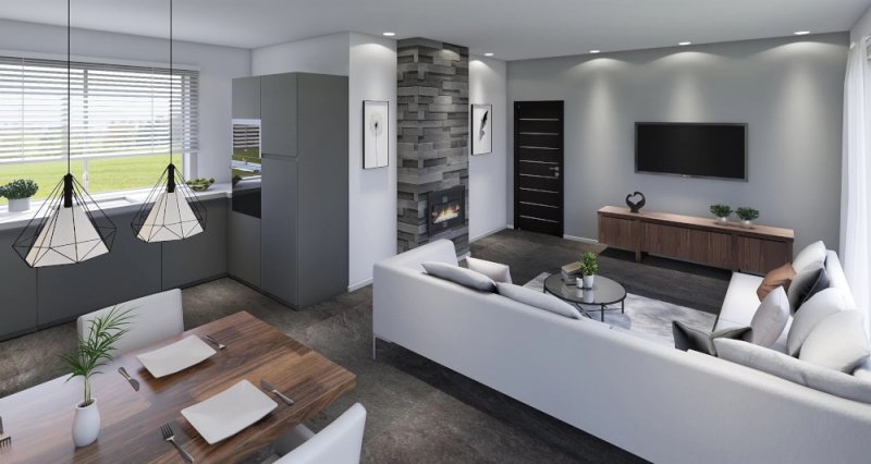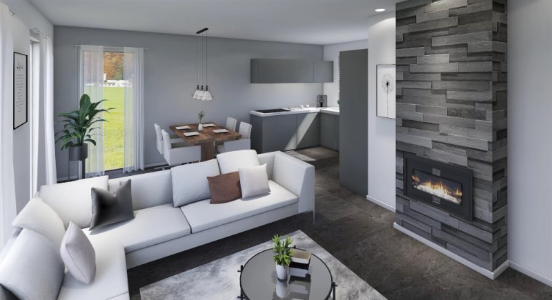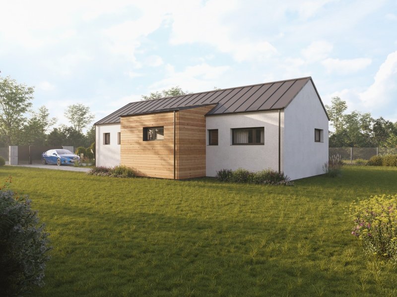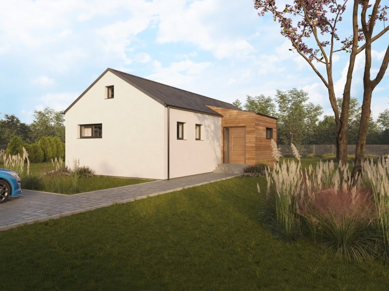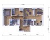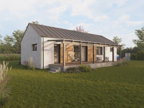 Dřevostavba o podlahové ploše 90 m2 . Lze ji ale postavit i ve větším rozměru a podobný půdorys nabízíme i v 96, 107 a 113 m2. Jedná se o montovanou dřevostavbu stavěnou na místě se sedlovou střechou ze sbíjených vazníků. Hodí se i do vesnické zástavby. Dispozičně se jedná o 3+kk s praktickou technickou místností. Lze využít i půdní prostor.