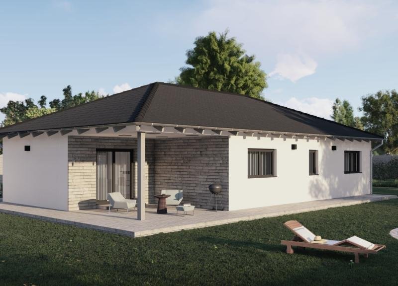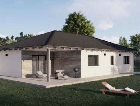 Bungalov s valbovou střechou a krytou terasou nabízí komfort životního prostoru spojeného se zahradou.