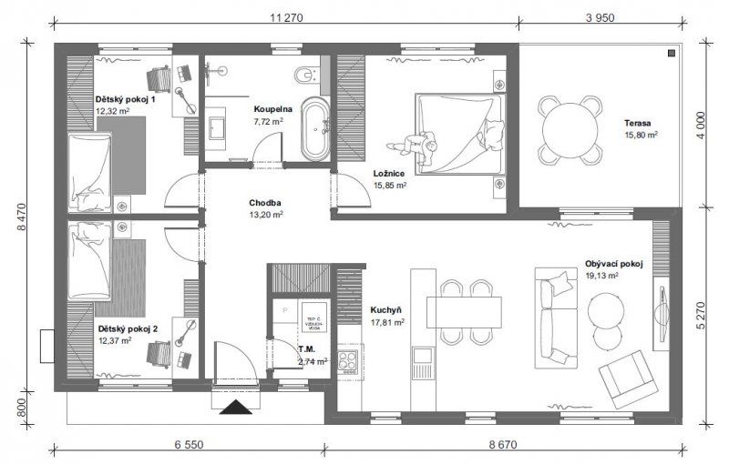 Téměř 16 m2 zastřešené terasy, která je přímo propojená s obývacím pokojem, vám dává možnost vychutnat si kávu na čerstvém vzduchu i za deště. Terasa nejen opticky zvětšuje velikost obývacího prostoru. Tři samostatné pokoje s příjemně velkou koupelnou nabídnou pohodlný život čtyřčlenné rodině.
