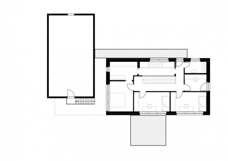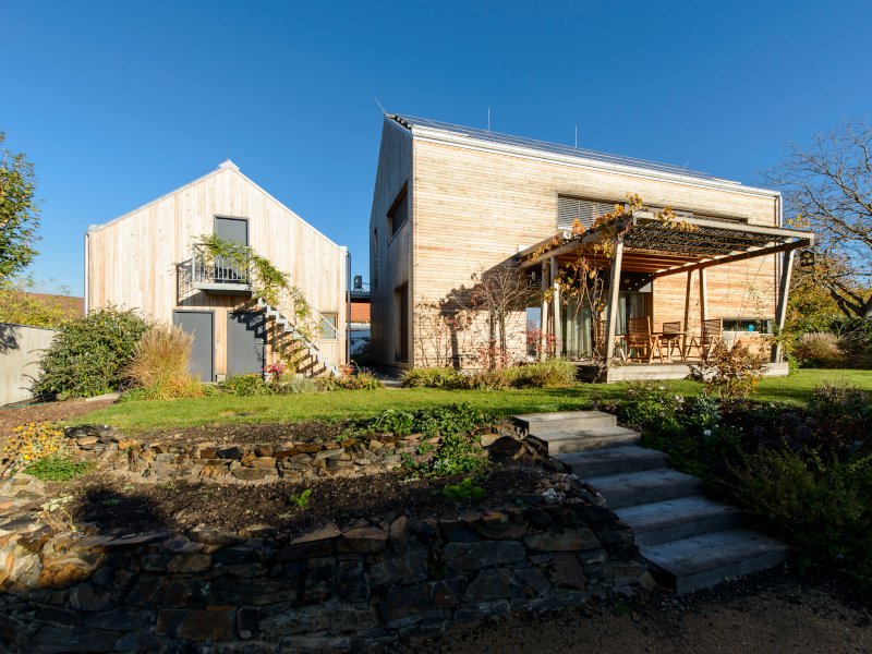 Moderní dřevostavba pro mladou, aktivní rodinu, citlivě zasazená do stávající zástavby historické obce – dnes okrajové městské části hlavního města Prahy. Hlavní prostornou a vzdušnou obytnou budovu doplňuje hospodářský objekt, který majitelé překřtili na „seník". V něm jsou umístěny sklady, dílna a dvě parkovací stání.