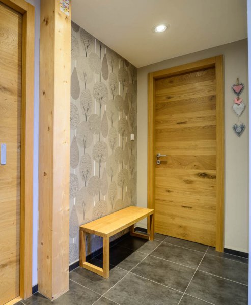 Výraznými akcenty obou stavení jsou fasáda z obkladů ze sibiřského modřínu a dřevěné sloupy podpírající terasu a zastřešení vstupu do domu, navržené v různých úhlech, jež domu dodávají dynamiku a eleganci.