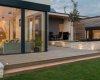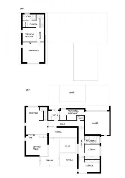 Hmota orientovaná rovnoběžně s komunikací – servisní část – je jednopodlažní s plochou střechou. Přesah střechy na vstupní straně kryje vstup do domu a do garáže a na straně patia vytváří velkorysý krytý venkovní obytný prostor. Na servisní část navazuje ve snížené úrovní noční část s ložnicemi a hygienickým zázemím. Tato hmota je pojednána minimalisticky s plochou ozeleněnou střechou bez přesahů, tak abychom omezili stínění patia. Patio je rozčleněno na tří výškové úrovně.