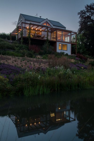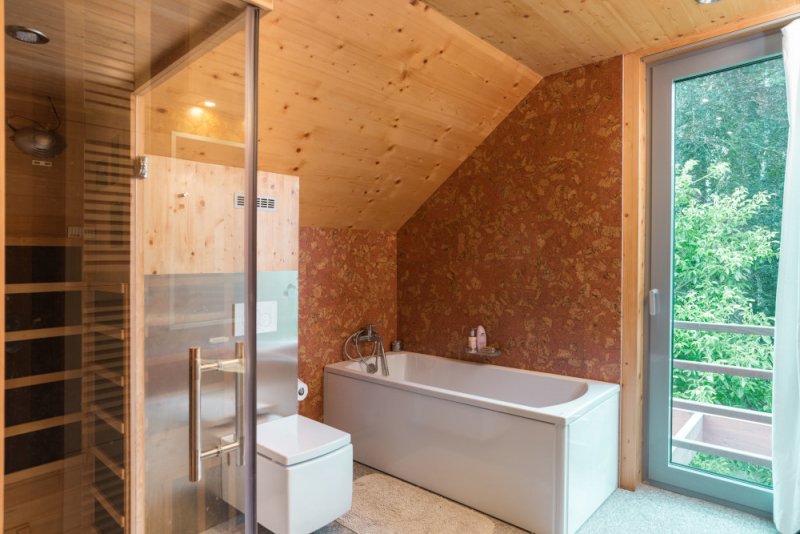 Konstrukční systém: masivní dřevěné panely KLH, stěny i stropy v pohledové kvalitě. Jedinečné řešení trojúhelníkové vikýře v pohledové kvalitě.