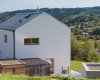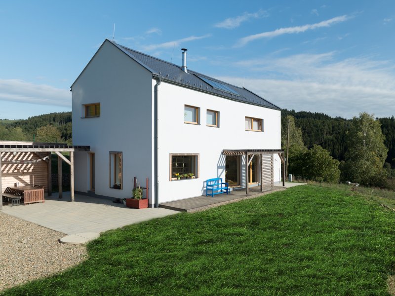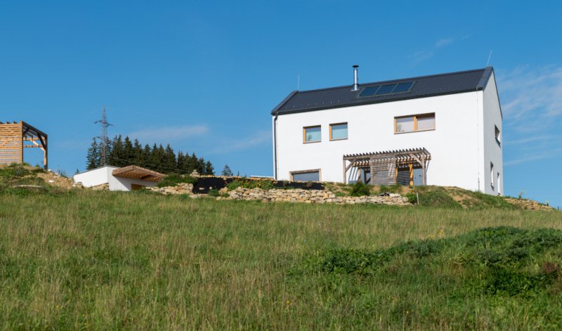 Stavba nenásilně „zapadá" do jižních členitých svahů Hostýnských vrchů. Zajímavou hrou bylo začlenění domu do bezmála hektarového, svažitého a obtížně přístupného pozemku bez vodovodu a kanalizace, avšak s dech beroucími výhledy a rozlehlým trnkovým sadem.