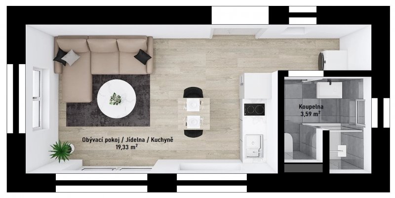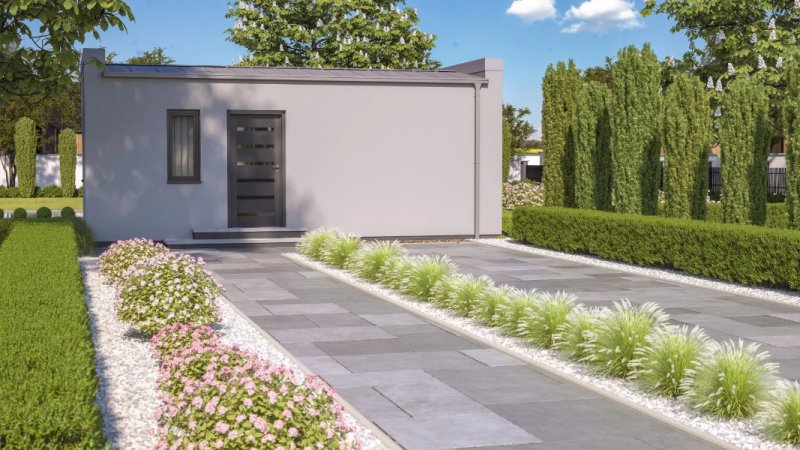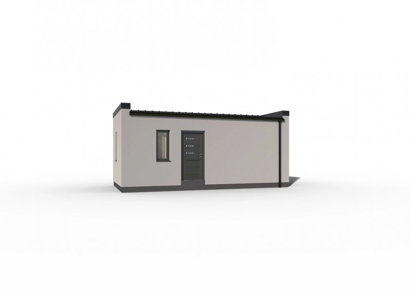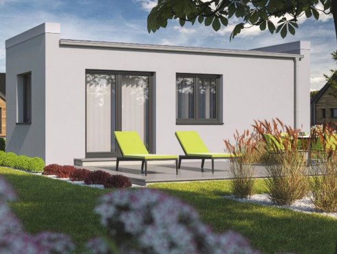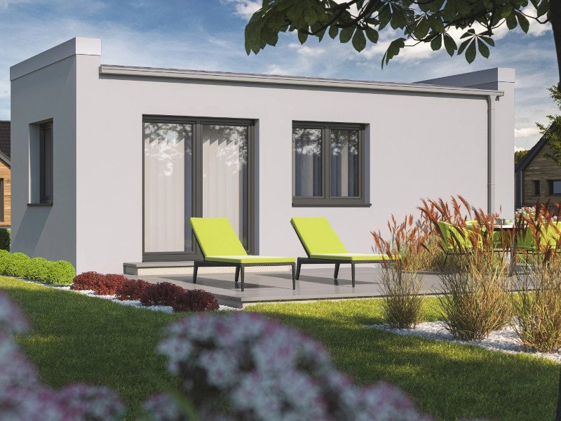 Bungalov Easy 1-23 je nejmenší z domů v nabídce Haas. Celý dům s užitnou plochou pouhých 23 m2 tvoří pouze obývací pokoj s kuchyškým koutem a koupelna. Bungalov vhodný k víkendovému bydlení na malý pozemek.