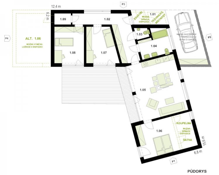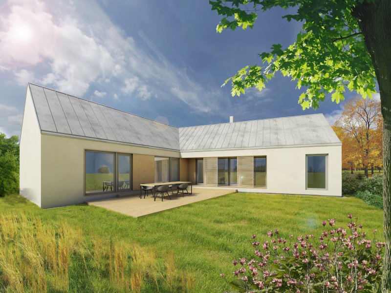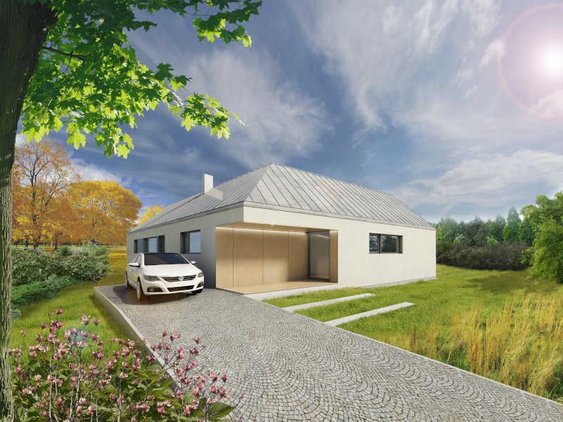Přízemní variabilní rodinný dům v nízkoenergetickém standardu navržený tak, aby bylo možné připojit kryté parkovací stání či garáž do celého konceptu rodinného domu. Další možností, který tento dům nabízí, jsou varianty umístění ložnice v pravém či levém křídle stavby s vlastní koupelnou a šatnou. Možnost uzavření závětří a vytvoření komory dle individuálních požadavků dává tomuto domu další přidanou hodnotu. Půdorys ve tvaru L vytváří soukromý prostor pro částečně zastřešenou terasu otevřenou do zahrady. Dům je vhodný pro rodinu s dětmi. Dispozice jsou promyšlené tak, aby zajistily veškerý komfort jeho uživatelům. Jedna část domu je určená pro společný život rodiny a druhá naopak poskytuje soukromí pro každého člena samostatně. Hlavní obytná místnost spojuje obývací část s kuchyní i jídelním koutem. V půdorysu nechybí ani technická místnost, prostorná koupelna a samostatné WC. Toto řešení rodinného domu skloubí nové ekologické bydlení se zdravým vnitřním klimatem na vlastním pozemku (v soukromém objektu bez přímých sousedů). Francouzská okna jsou orientována na částečně zastřešenou terasu směrem do zahrady. Provozní náklady energeticky úsporného domu nezatíží vaši peněženku, realizace Vaší představy od projektu po konečnou finalizaci stavby pod jednou firmou zajistí Vaši plnou spokojenost.