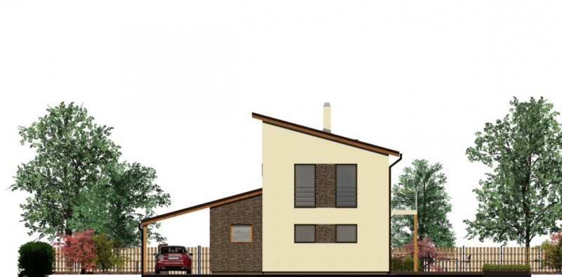 Přesah střechy a balkon na jižní straně přirozeným způsobem zastiňují obytné prostory a chrání je před přehřátím. Vnější povrchy jsou navrženy v dřevěném, svisle orientovaném obložení v kvalitě dle volby zákazníka. Architekturu doplňuje venkovní komín.