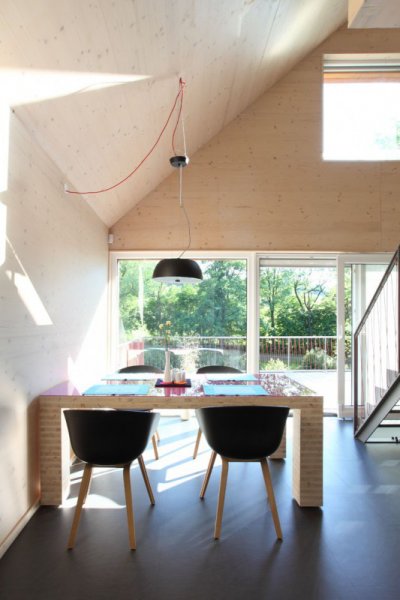Hlavní obytný prostor přízemí spojuje obývací pokoj s kuchyní a jídelnou. Pokračováním tohoto prostoru je terasa, která prodlužuje dům do zahrady skrz prosklenou stěnu. V druhé části dřevostavby se nachází zázemí a pokoje. V patře je možné realizovat samostatný pokoj, druhou koupelnu, pracovnu, pokoj pro hosty atp.
