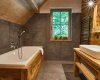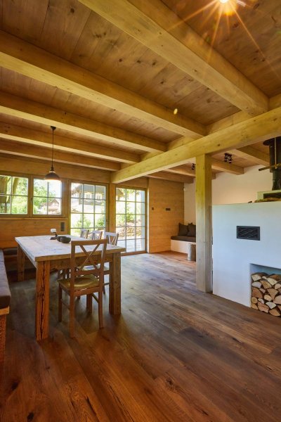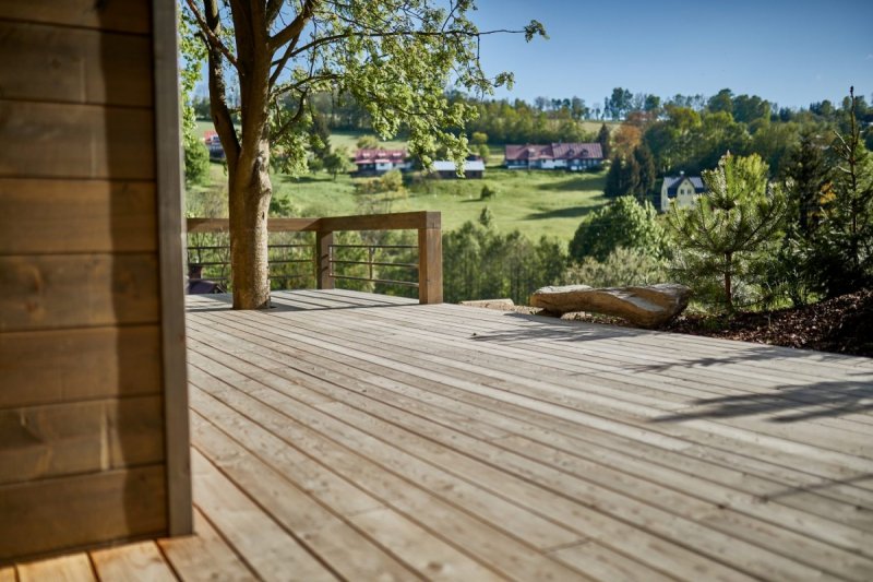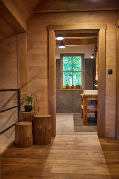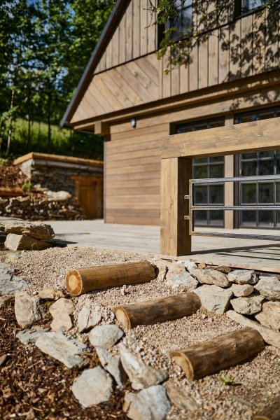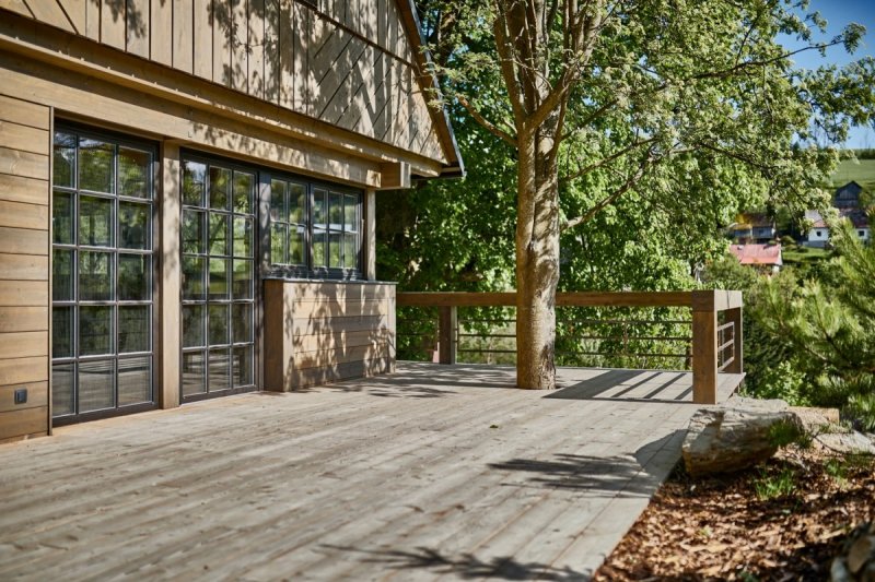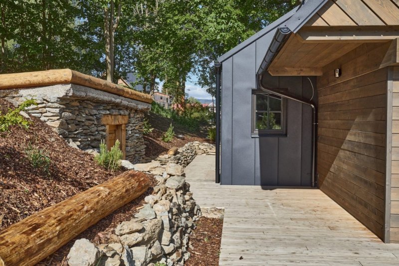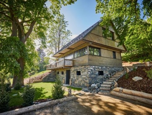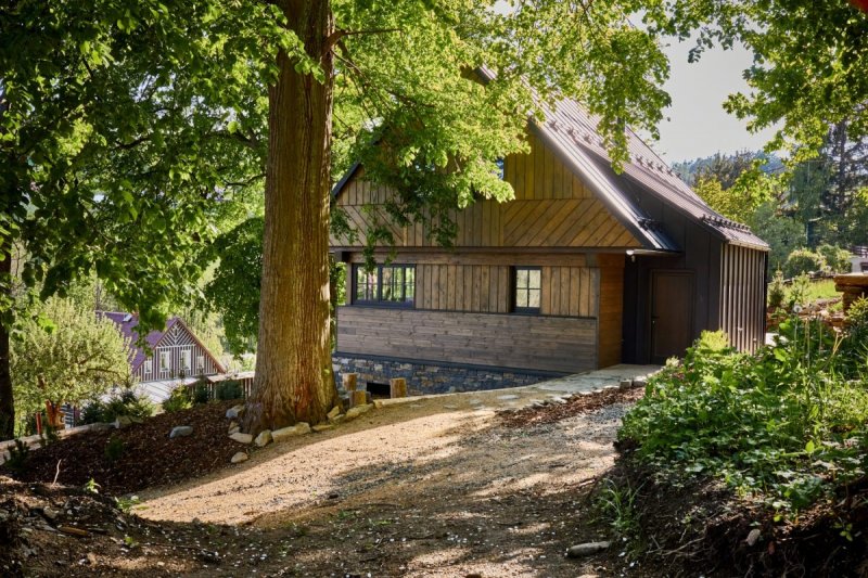 V malebné horské vesničce na úpatí Krkonoš se na pozemku pod korunami vzrostlých stromů ukrývá moderní dřevostavba doplněná o tradiční prvky typické pro horskou architekturu.