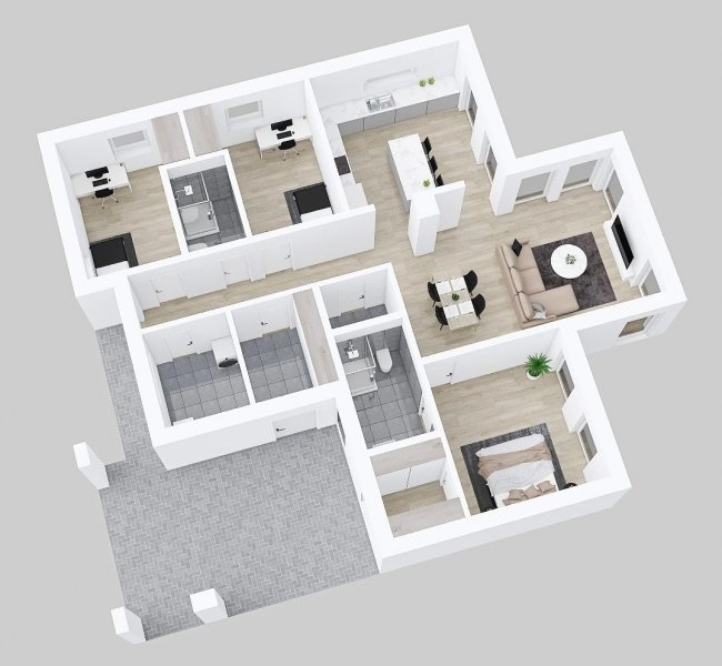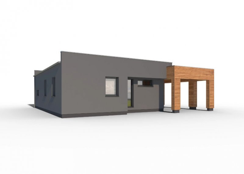 Moderní bungalov Inspirace 2-119 zaujme jednoduchými liniemi. Zajímavě řešený půdorys s dispozicí 4 + 1 se dvěma koupelnami, technickou místností, spíží a šatnou na užitné ploše 119 m2, doplňuje velkorysý krytý vstup, využitelný i jako parkovací stání.