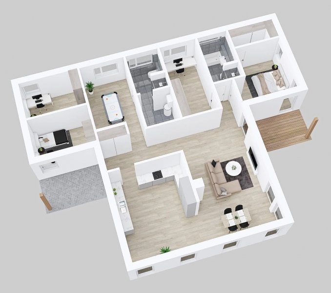 Bungalov Inspirace 3-146 skrývá za rovnými liniemi moderního vzhledu velký obývací pokoj s oddělenou kuchyní, které lze jednoduše propojit. Další tři ložnice a pracovnu doplňuje ještě herna a dvě koupelny, šatna a technická místnost. U vstupu do domu je kryté závětří a na druhé straně domu krytá terasa, navazující na obývací pokoj.