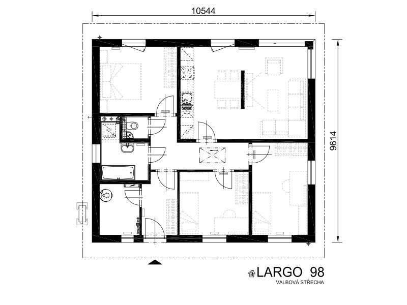 Jednoduchý čtvercový půdorys činí z domu LARGO 98 velmi variabilní stavbu. Dům si přizpůsobíte dle dispozic své parcely. Doporučujeme umístit okna obývacího pokoje na jih, abyste si mohli i v zimě užívat energie ze slunečních paprsků. Francouzské okno vedoucí z obýváku vybízí ke stavbě venkovní terasy, na které si vždy odpočinete. Dům LARGO 98 je nejoblíbenější bungalov z produkce naší společnosti.