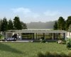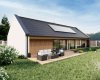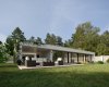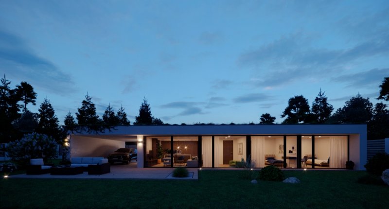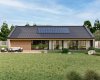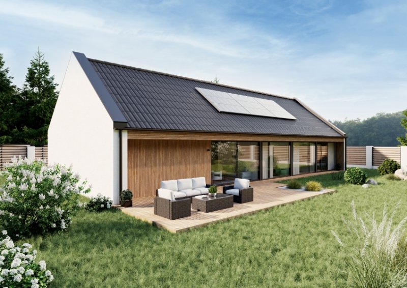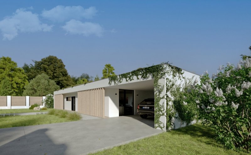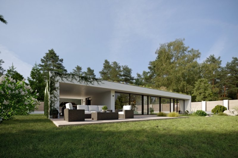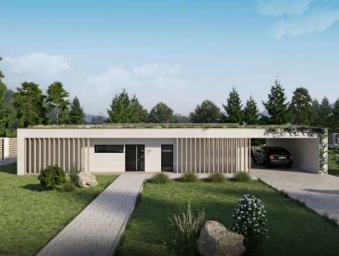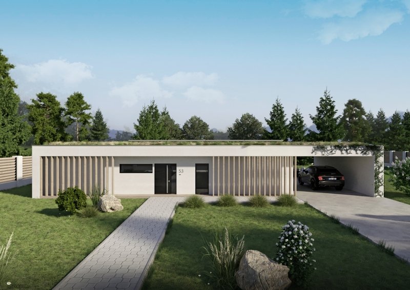 Dům je zcela zasazen do konceptu přírody, kdy zelená střecha navodí oku lahodící pocit, ale umístěná fotovoltaika poskytne efektivní využití moderních technologií v domácnosti. Pokud jste milovníky výhledu do krajiny a velkých světlých místností, tento dům je Vám šitý na míru.