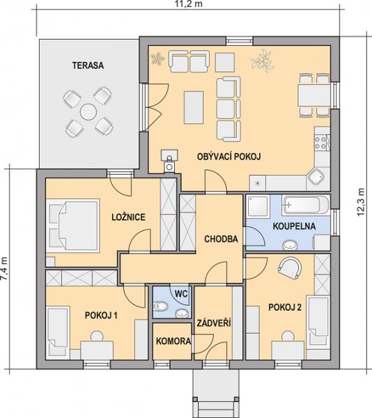 LINDA je dům větší velikostní kategorie • vhodný do jednopodlažní zástavby • uspokojí 3 – 4 členné rodiny • třetí pokoj lze využít jako dětský pokoj, pracovnu nebo jako pokoj pro hosty.
