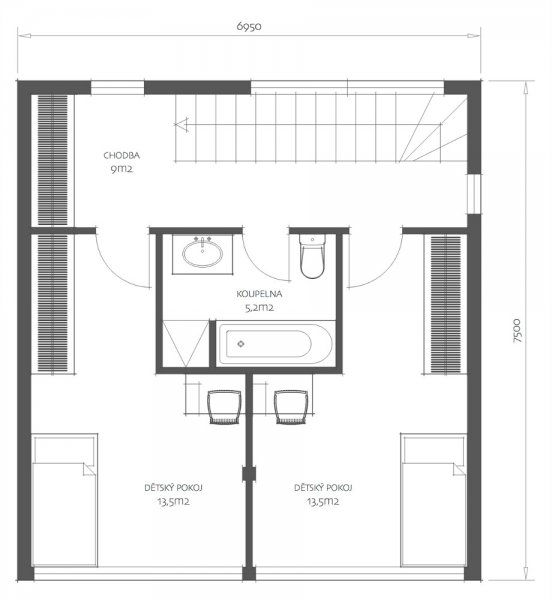 Moderní, dvoupodlažní dřevostavba na klíč s chytře vymyšlenou dispozicí. Tato dřevostavba na klíč je určená pro čtyrčlenou rodinu. V prvním patře domu se nachází obývací pokoj, kuchyň s jídelním koutem a velká ložnice s vestavěnou skříní. Ve druhém patře se nachází dva stejnoměrně rozložené dětské pokoje s koupelnou. Na přání zákazníka je možná změna dispozice - ZDARMA.