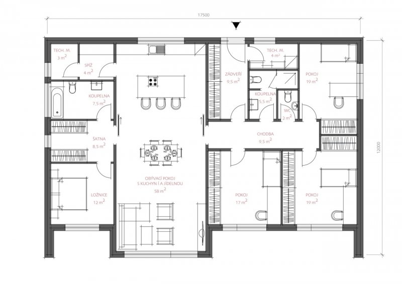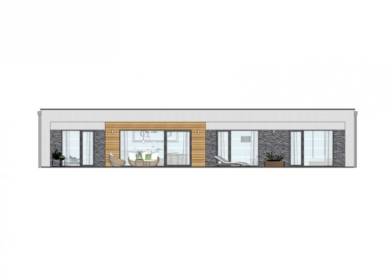 Moderní, přízemní dřevostavba na klíč s plochou střechou určený pro čtyřčlennou případně pětičlennou rodinu. Vedle prostorného obývacího pokoje s kuchyní a jídelnou se nachází ložnice s vlastní koupelnou a šatnou. Z druhé strany pak dva stejnoměrně rozložené dětské pokoje a pokoj pro hosty / pracovna / třetí dětský pokoj. Na přání zákazníka je možná změna dispozice - ZDARMA.