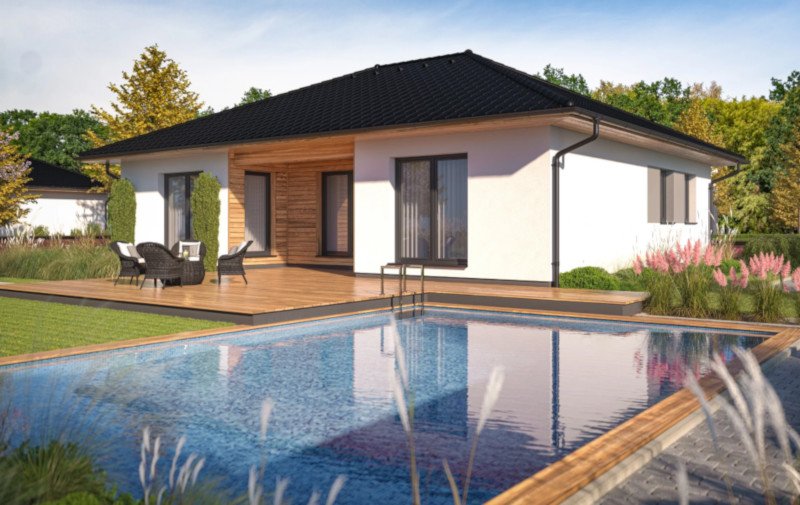 Bungalov Lucky 2-110 má užitnou plochu 110 m2, která v sobě skrývá šikovně řešené členění na 3 ložnice, koupelnu s WC, samostatné WC, šatnu, technickou místnost a prostorný obývací pokoj s kuchyňským koutem, vyústěným v polozakrytou venkovní terasu.