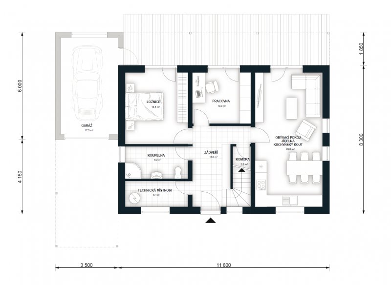 Krásná pětipokojová dřevostavba na klíč, která vyhovuje zejména zájemcům s širším a méně hlubokým pozemkem.