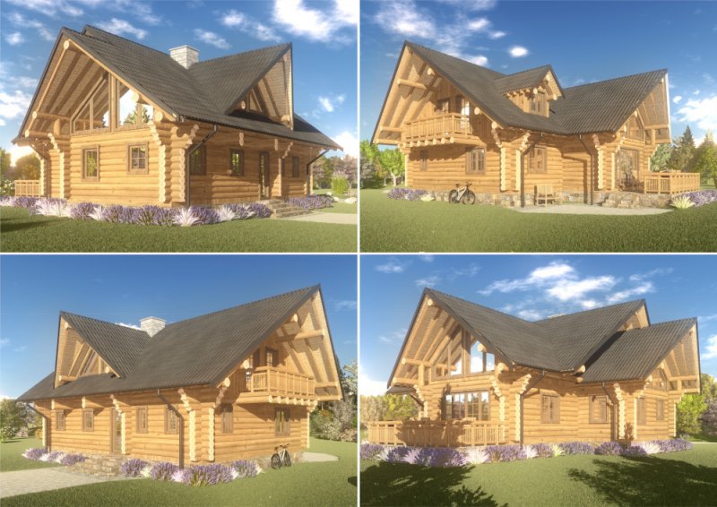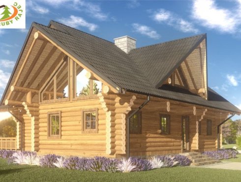 Srubový rodinný dům střední velikostní kategorie se čtyřmi obytnými místnostmi a prostornou kuchyní. Velké balkonové dveře a prosklené štíty dodávají prostorné galerii dostatek světla.