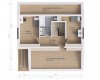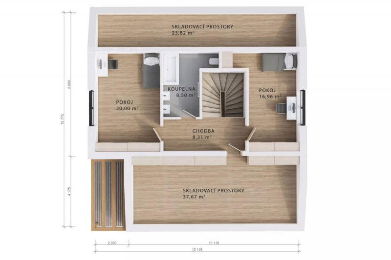 V horním patře jsou umístěny dva pokoje a koupelna a místnosti se zkoseným stropem po obvodu domu je možno využít jako úložné prostory, skladovací místnosti či zázemí pro fotovoltaické panely.