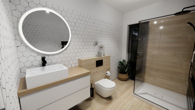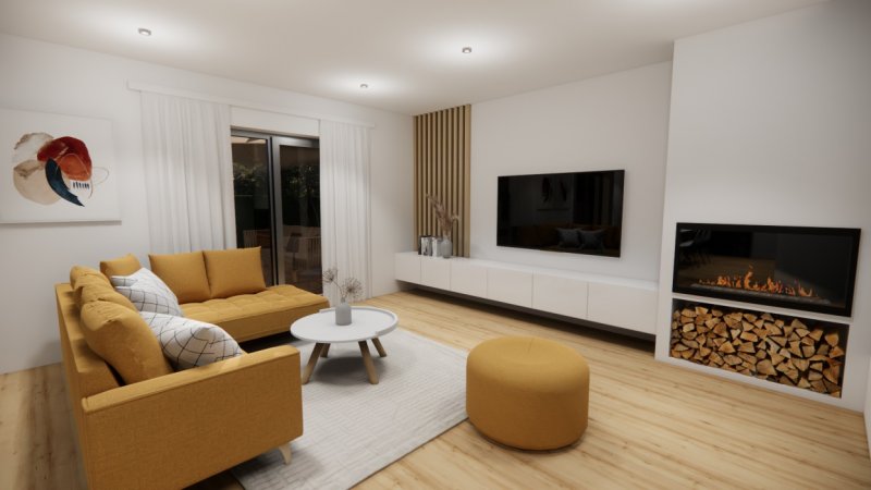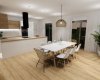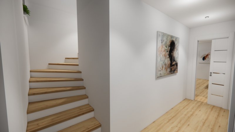 Společně s prostorným obývacím pokojem, spojeným s kuchyňským koutem 48,88 m2, nalezneme v přízemí také technickou místnost, zádveří, spíž a WC spojené s koupelnou.